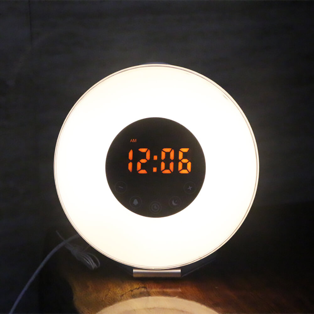 Будильник с имитацией рассвета Galo настольный делает просыпание в зимнее время более комфортным. Стильный минималистичный аксессуар впишется в любой дизайн. За эффект рассвета и солнечных лучей отвечает круговая подсветка вокруг циферблата, состоящая из 36 цветных и теплых белых светодиодов. Внутри электронный световой будильник показывает точное время, там же расположено сенсорное меню управления. Будильник электронный также поддерживает 6 звуковых сигналов либо сигналов с радио. Цифровой будильник с имитацией рассвета может работать от сети или от USB кабеля, получая питание от компьютера, повербанка.